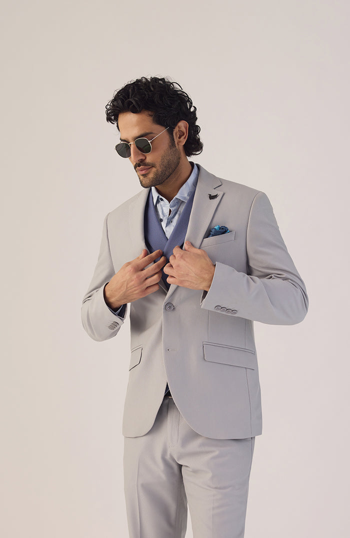 Two Piece Light Grey Textured Formal Suit - Dave [₹ 8,847]