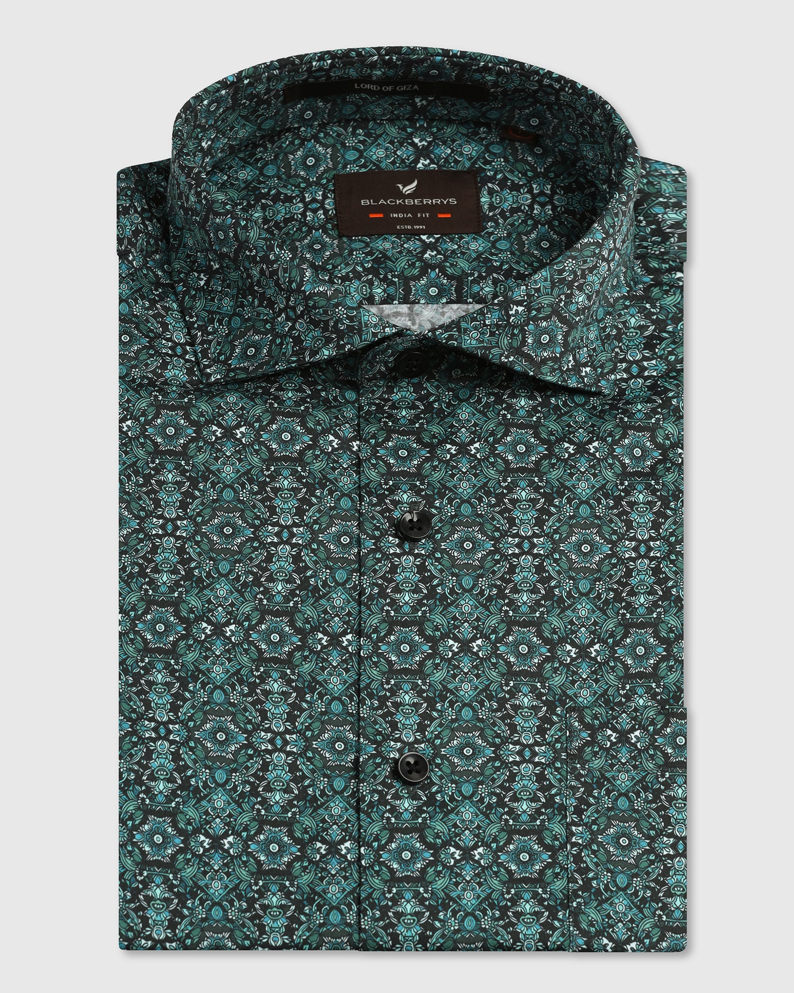 Convey a sense of understated confidence and charisma with this Formal Shirt presented in luxury Giza yarn that gives a lustrous fabric finish and incredible softness. This formal shirt is designed to an India fit with a high stance collar, long extended placket and unique signature print, giving you a charmingly refined look for work and leisure occasions. A hint of subtle sheen enriches the polish.