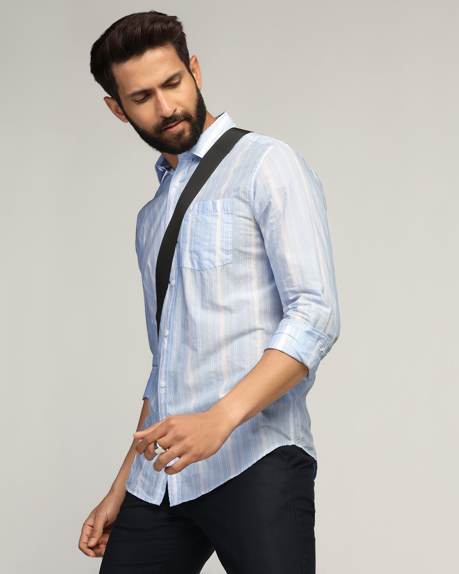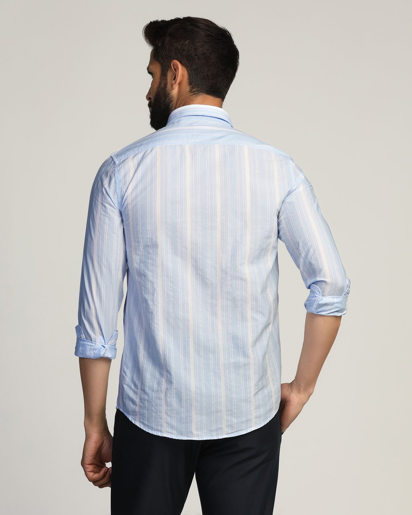 Refresh your wardrobe with the Striped Casual Shirt. Crafted from premium woven fabric, this slim-fit shirt features a semi cut-away collar and dobby weave for subtle texture. Full sleeves and a chest pocket add practicality without sacrificing style. The versatile touch is perfect for any occasion.