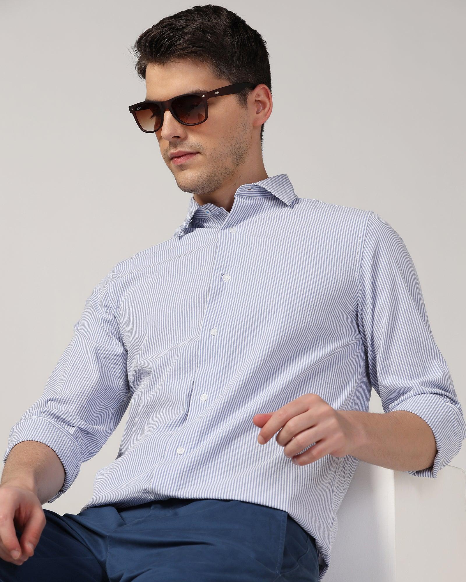 Amplify your fashion quotient by wearing this Blue Striped Casual Shirt. Featuring a refined semi-cutaway collar, this collared shirt exudes contemporary elegance. Crafted from meticulously woven fabric, it delivers both comfort and quality. The slim fit silhouette, combined with full sleeves, offers a sleek and modern look, while the chest pocket adds a dash of functionality. In a charming blue hue, this shirt is a versatile addition to your wardrobe.