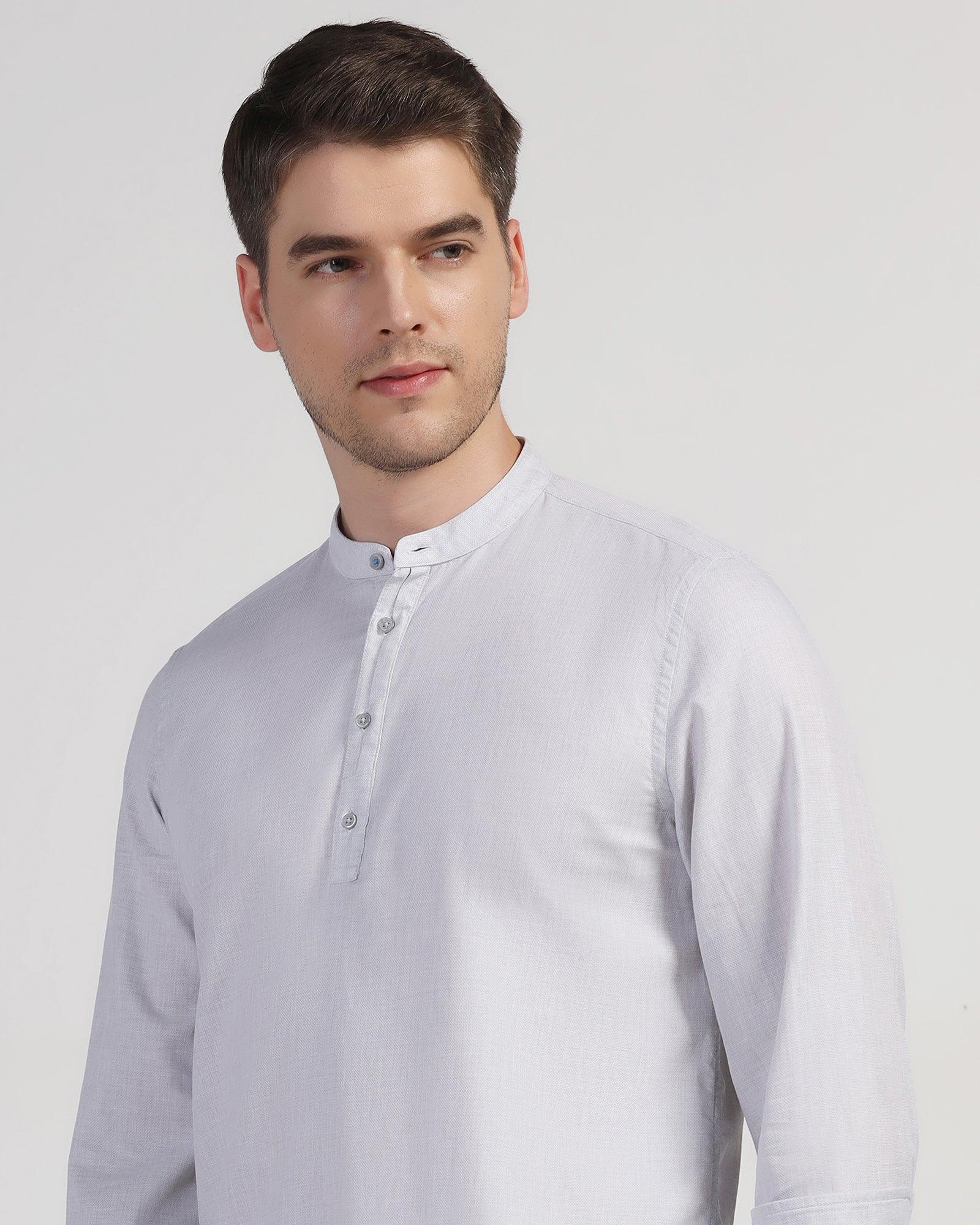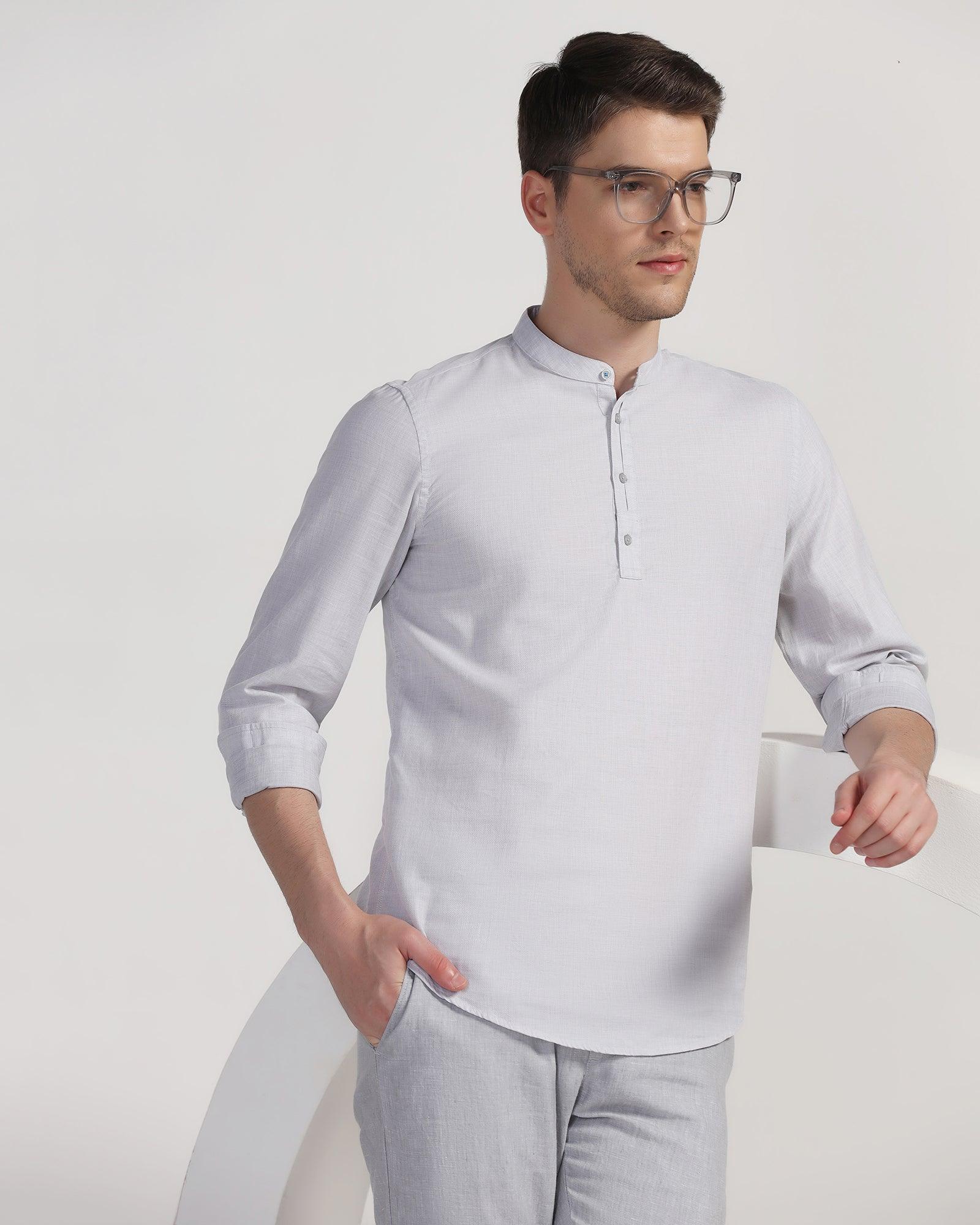 Be in the limelight with this Grey Solid Shirt. Crafted to perfection, this versatile piece exudes classiness and style. Tailored for a sleek silhouette, its India Fit design offers a modern and flattering look. With full sleeves, this collared shirt easily transitions from office to evening outings. The timeless grey hue adds a touch of refinement to any ensemble, making it a wardrobe essential for the discerning gentleman.