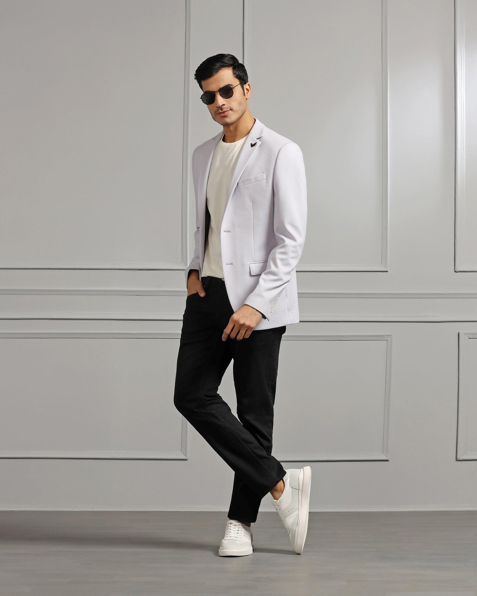 Elevate your sense of style with this Lavender Solid Formal Jacket, boasting refined classiness. Meticulously crafted from knitted stretchable fabric, this dobby patterned jacket has a tailored slim fit that gracefully contours your silhouette. The single-breasted design exudes a contemporary allure, and the inclusion of flap pockets seamlessly blends functionality with flair.