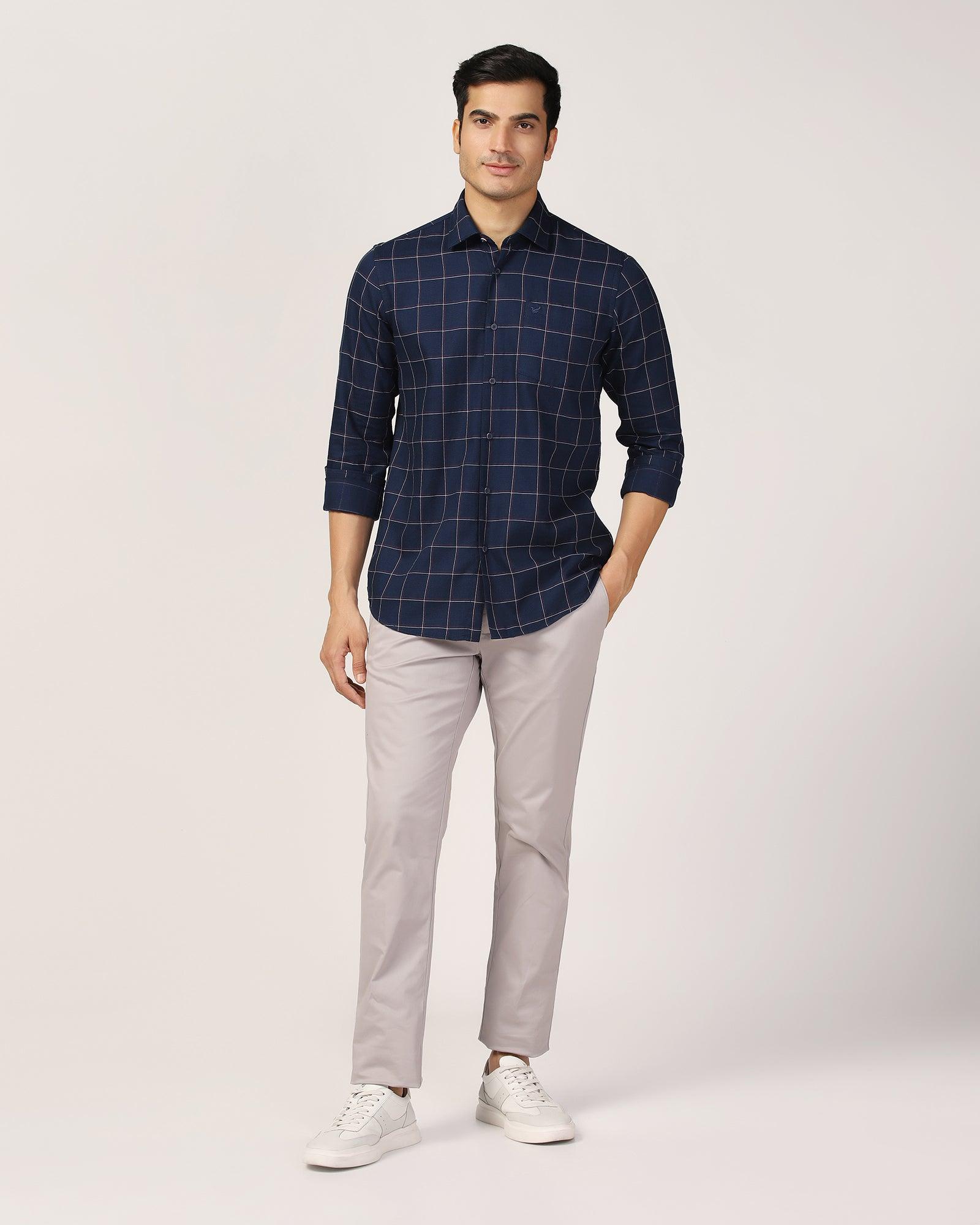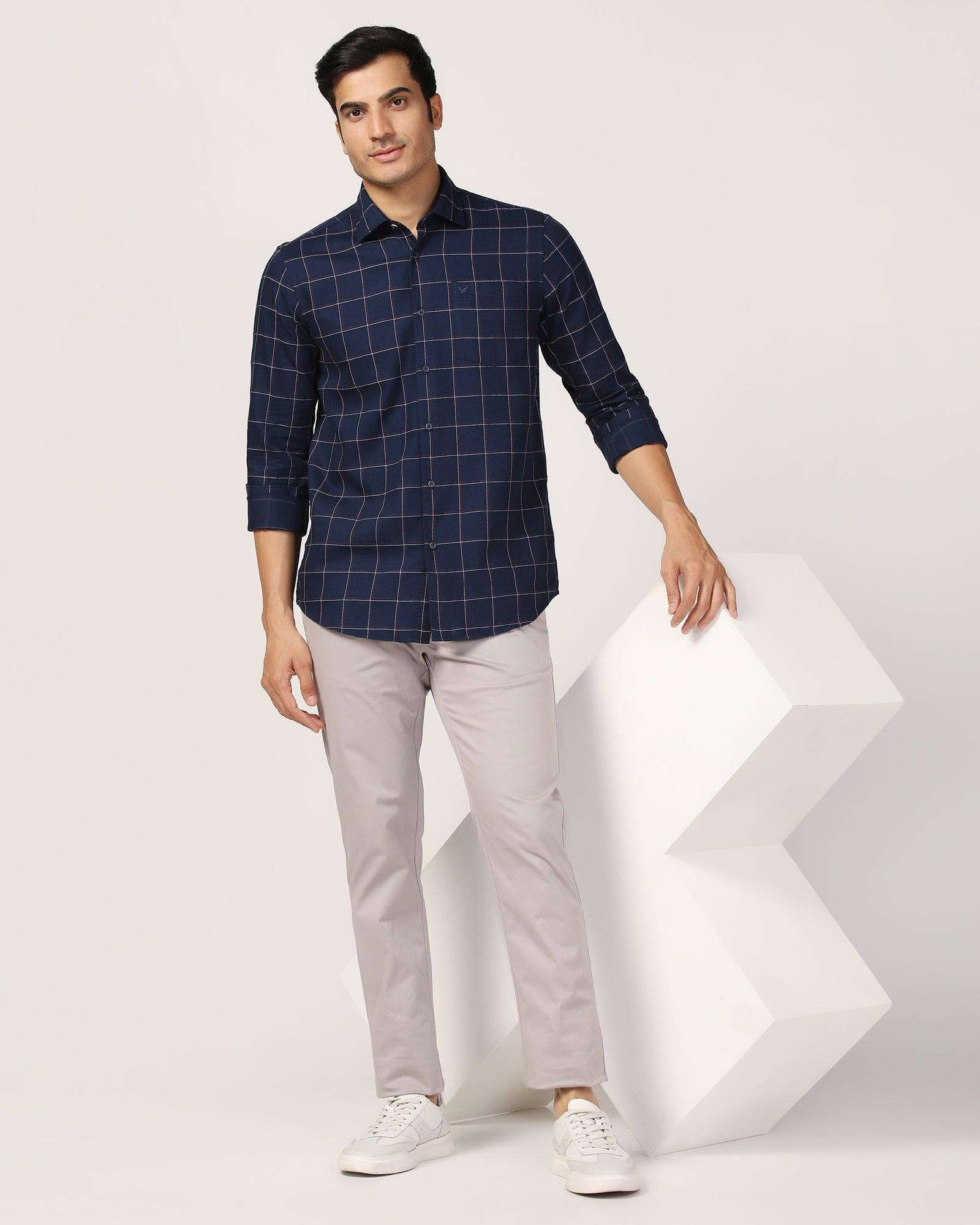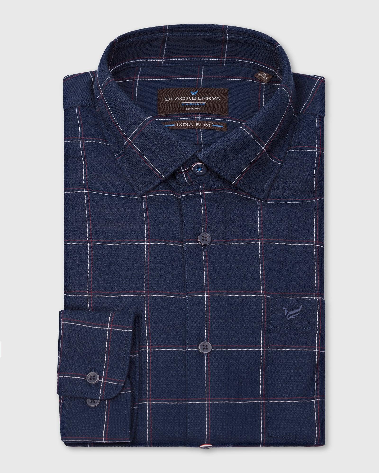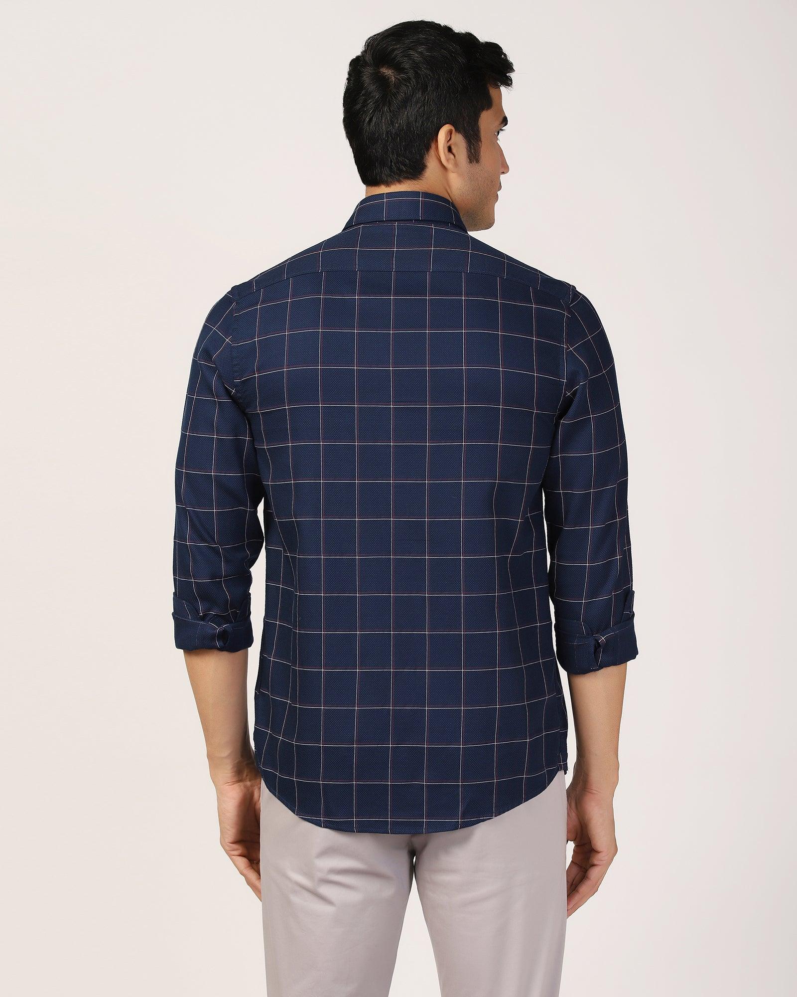 Revamp your style and comfort level with the Navy Checked Shirt. Featuring an India Fit, it accentuates your silhouette while providing ease of movement. The timeless navy hue exudes classic charm, while the full sleeves offer versatility for any occasion. Crafted from premium fabric, this check shirt for men ensures a soft and cosy feel, making it a must-have addition to your wardrobe.