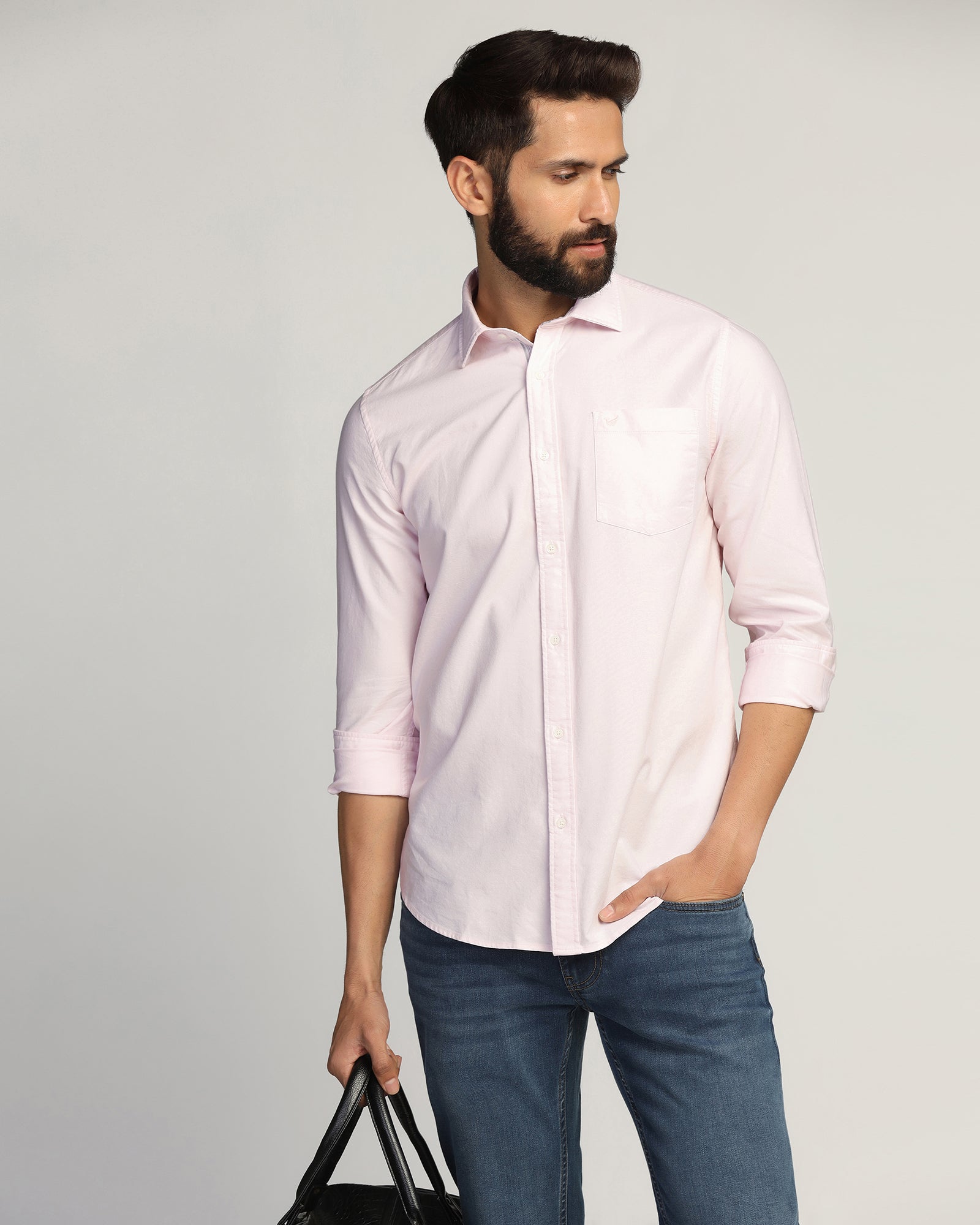 Give your wardrobe a dash of charm with the Semi Cut Away Casual Shirt. Crafted from high-quality woven fabric with an Oxford weave, this slim fit shirt provides a refined finish. Full sleeves and a chest pocket provide versatility and a touch of modernity, ideal for both casual and formal wear.