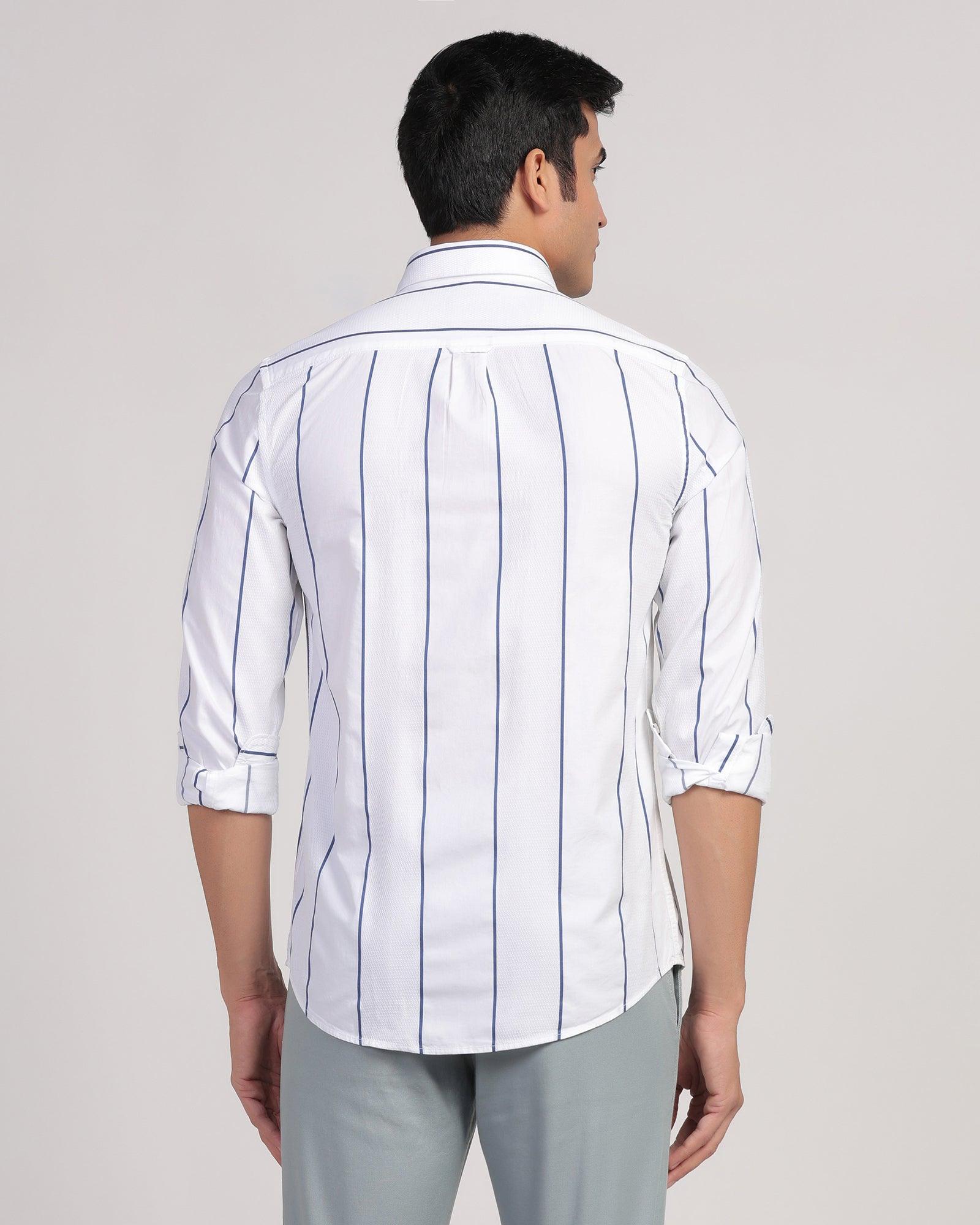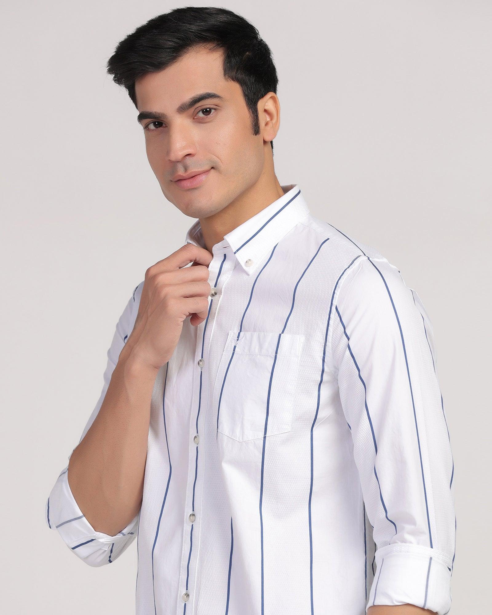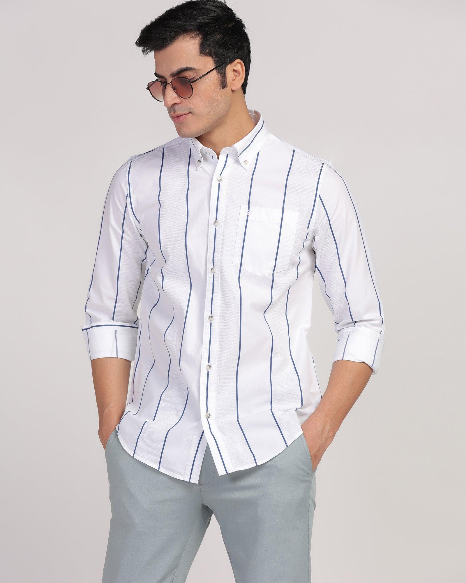 Step into sophistication with our White Stripe Shirt – an embodiment of timeless elegance crafted to perfection. Tailored in an India Fit, this shirt seamlessly combines comfort with a refined silhouette, making it an ideal choice for any occasion. The full sleeves add an extra layer of refinement, ensuring you make a statement.