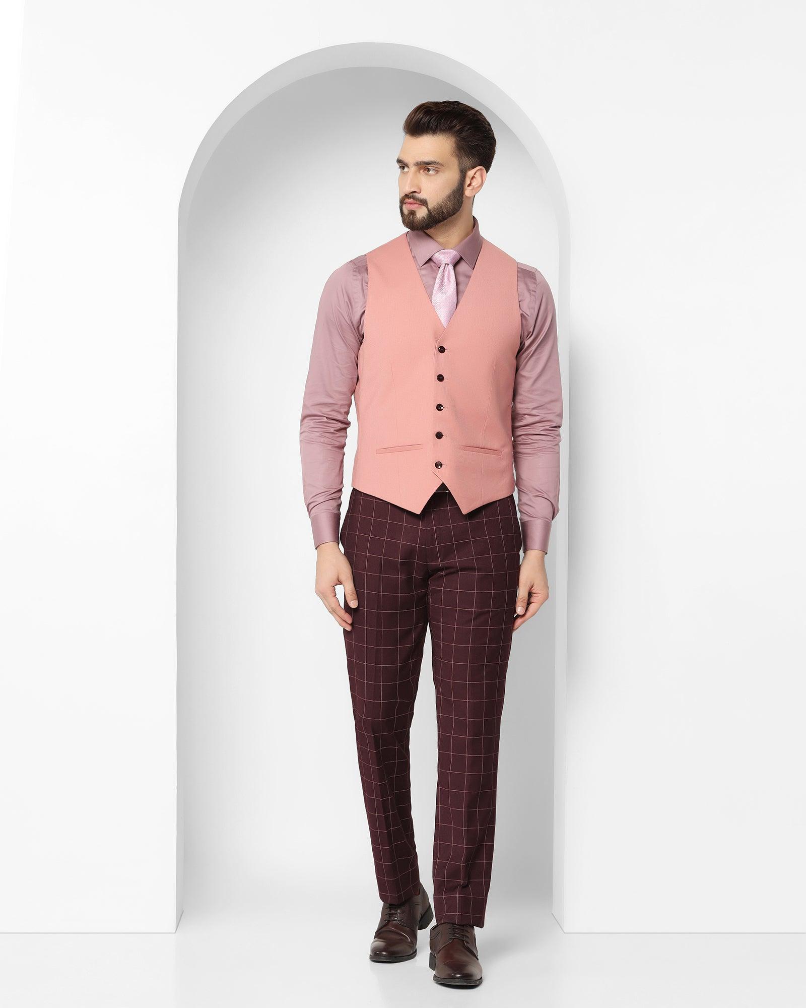 Experience sartorial excellence with this Wine Check Tuxedo Suit, a symbol of confidence and sophistication. This suit boasts a textured pattern that adds depth and character to your ensemble. With its slim, comfortable fit, you'll experience unparalleled comfort without compromising style. The notch lapel of this suit exudes a classic charm, while the single-breasted design adds a touch of sophistication.