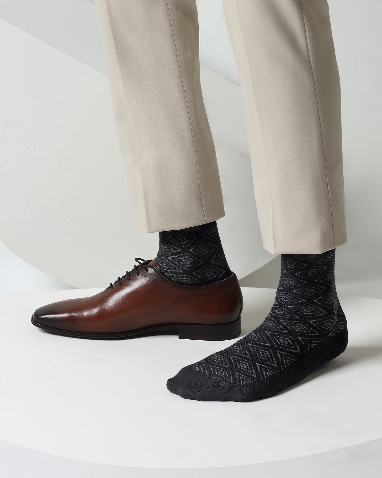 Command attention with the Patterned Formal Socks, where class meets cool style. Crafted from premium double-mercerised fabric, they offer a luxurious feel for all-day comfort. The intricate geometric pattern creates a striking yet versatile accent, while the ribbed crew-length design adds texture.