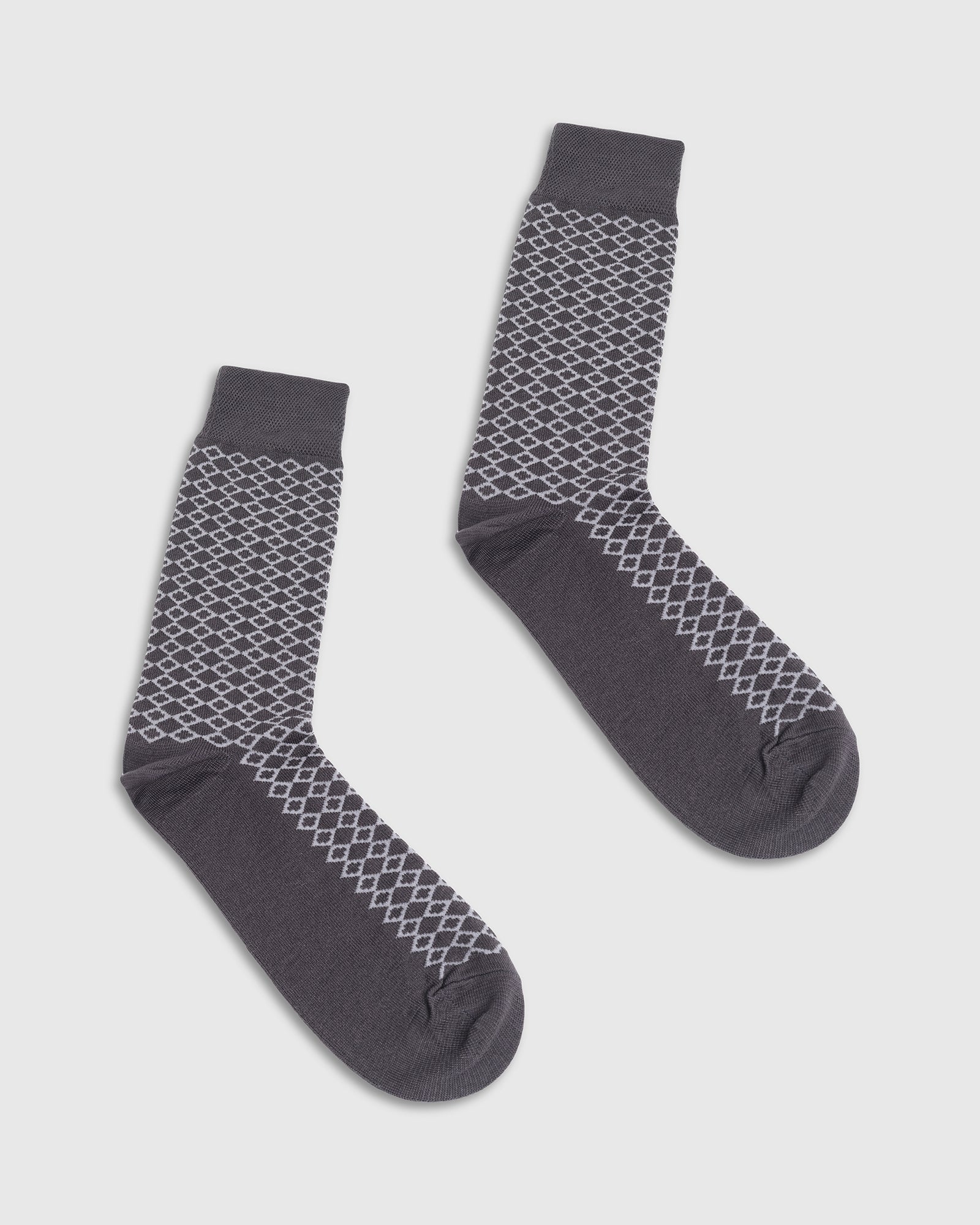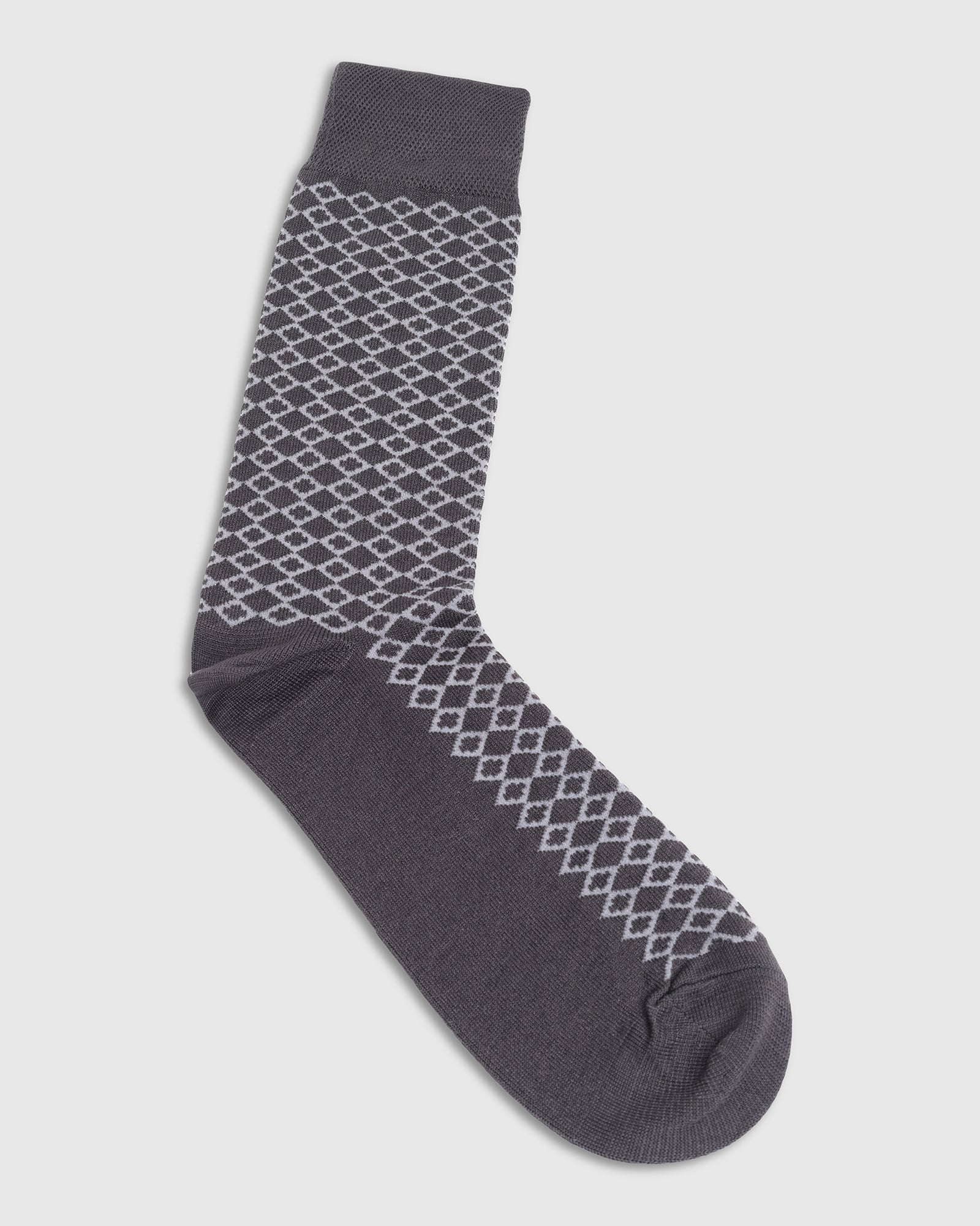 Upgrade your wardrobe with these Patterned Formal Socks, a seamless blend of luxury and classy style. Crafted from premium double-mercerized fabric, they offer an ultra-soft feel with lasting comfort. The bold geometric pattern, crew-length fit, and ribbed design create a striking visual appeal.
