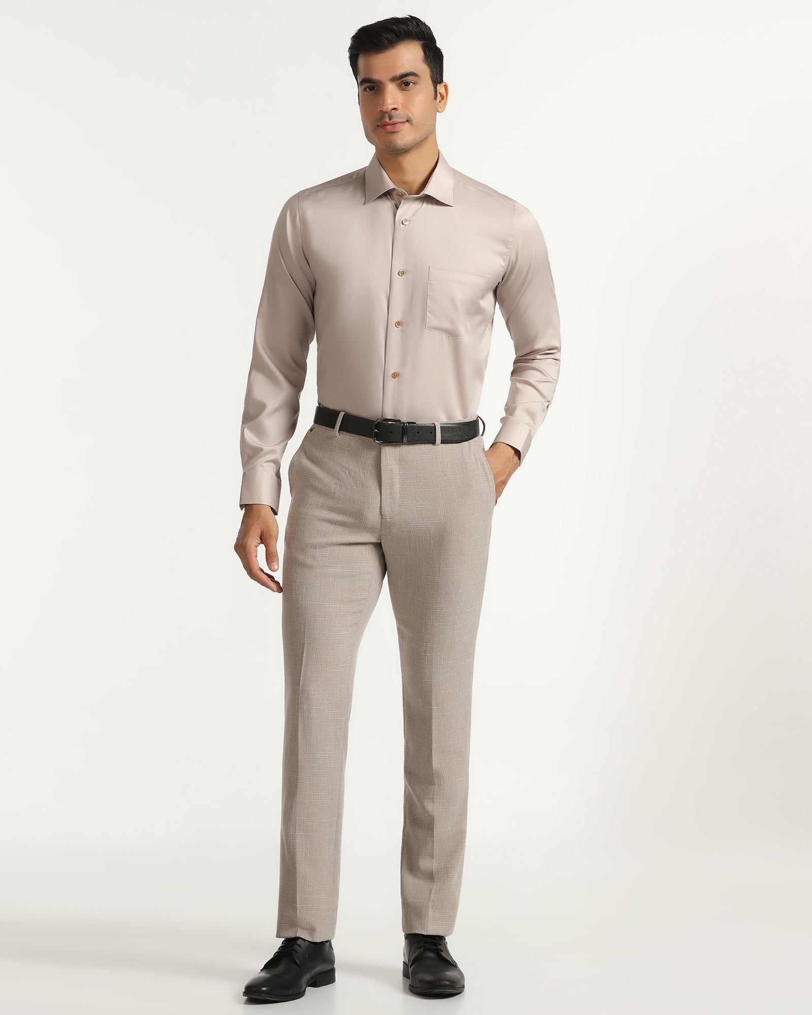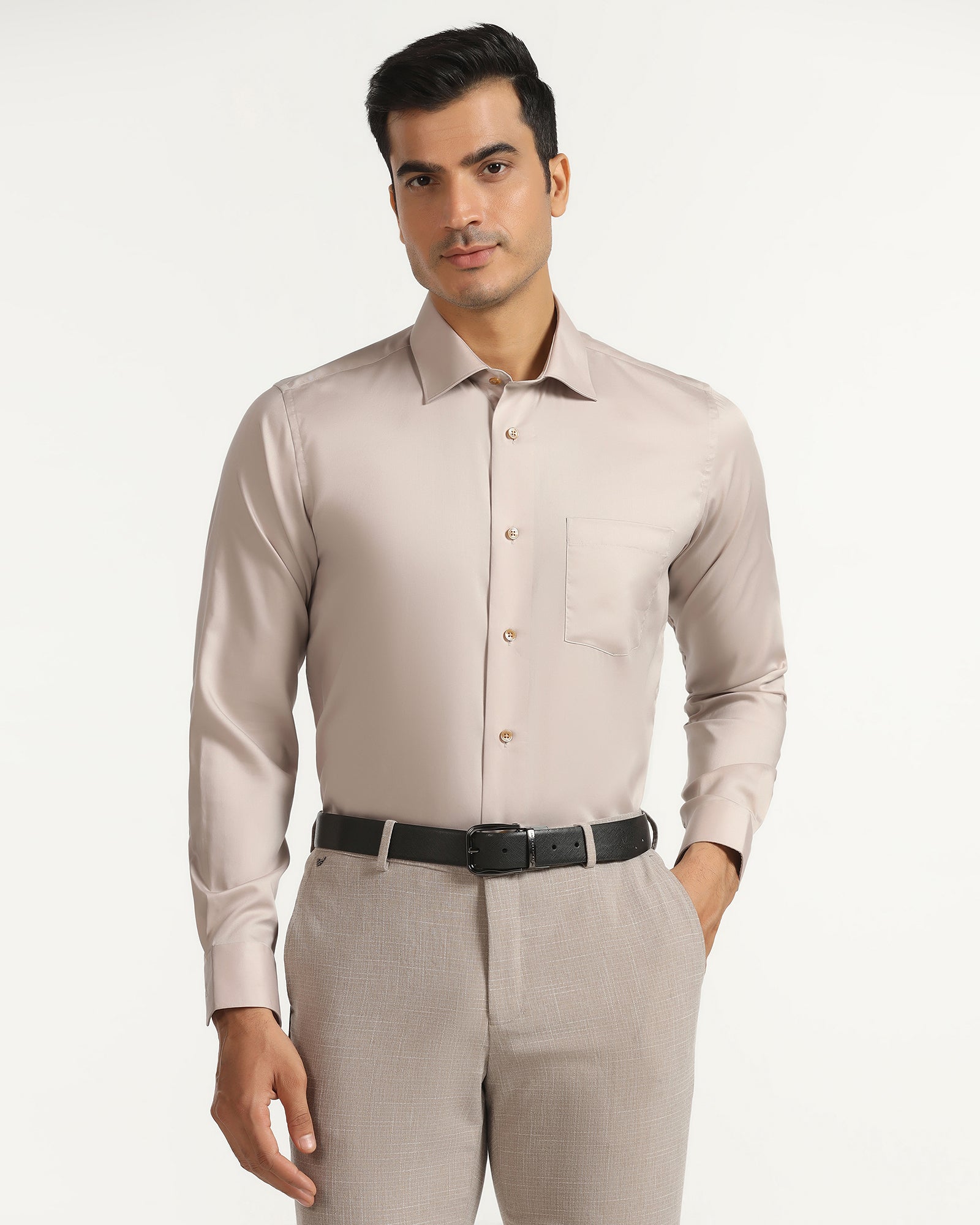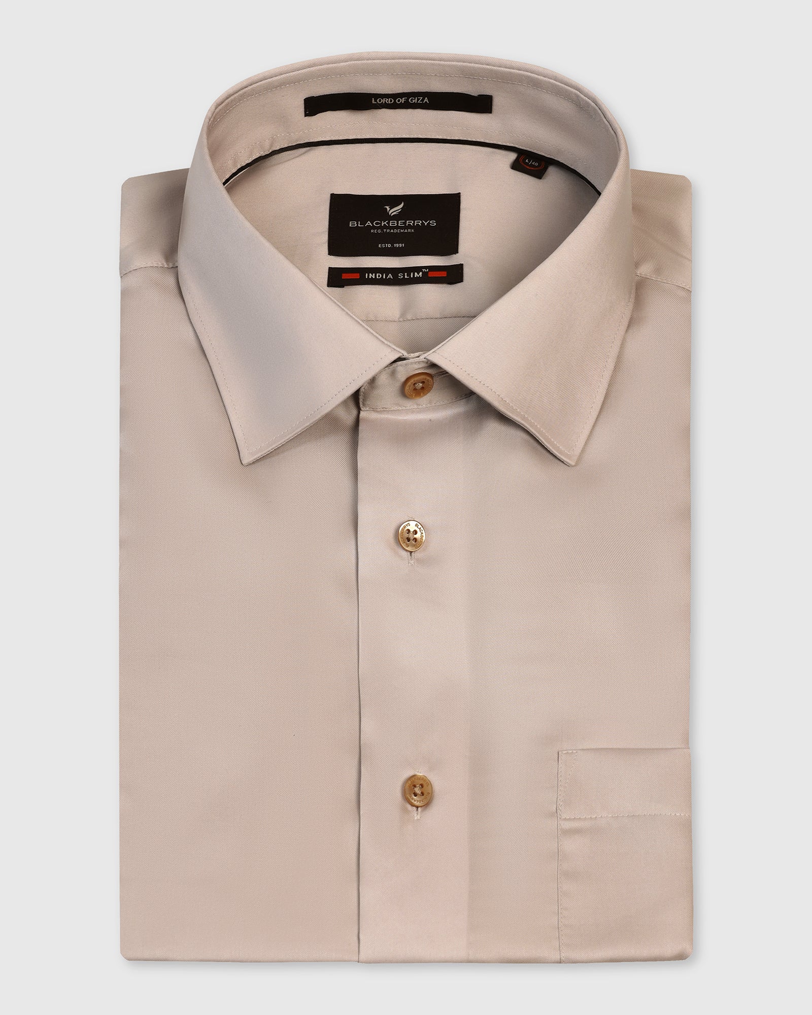 Elevate your formal wardrobe with the Solid Formal Shirt, crafted from premium Giza yarn for a classy touch. Designed in an India Fit, it offers a subtle sheen, perfect for all occasions. The high-stance collar, creaseless armholes, and extended placket ensure a sophisticated and polished look.