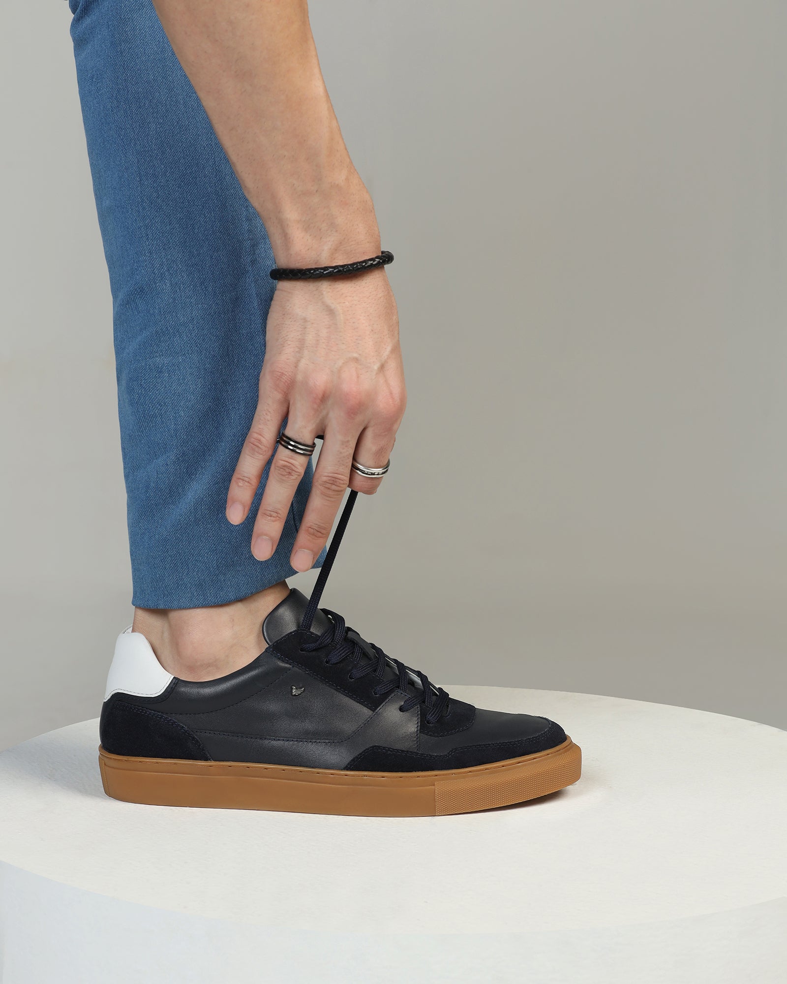 Step into elegance with these Navy Leather Casual Sneakers. They are made from 100% high-quality leather and have a deep navy colour that goes well with all of your casual clothes. These sneakers are lightweight, which makes walking easy, and the comfortable sole gives your feet great support all day long. They are simple to clean and help prevent tiredness in your feet, making them a great choice for any number of casual occasions.