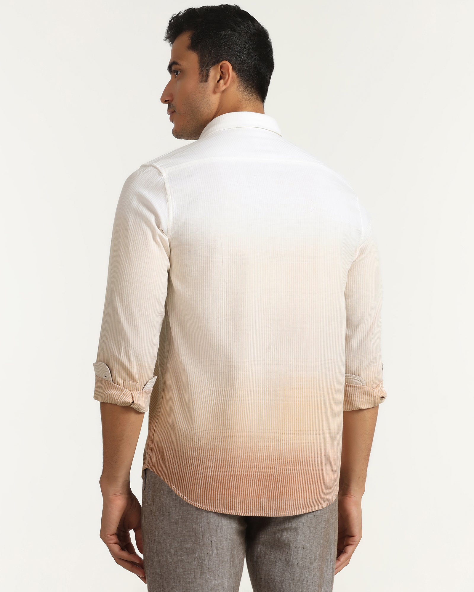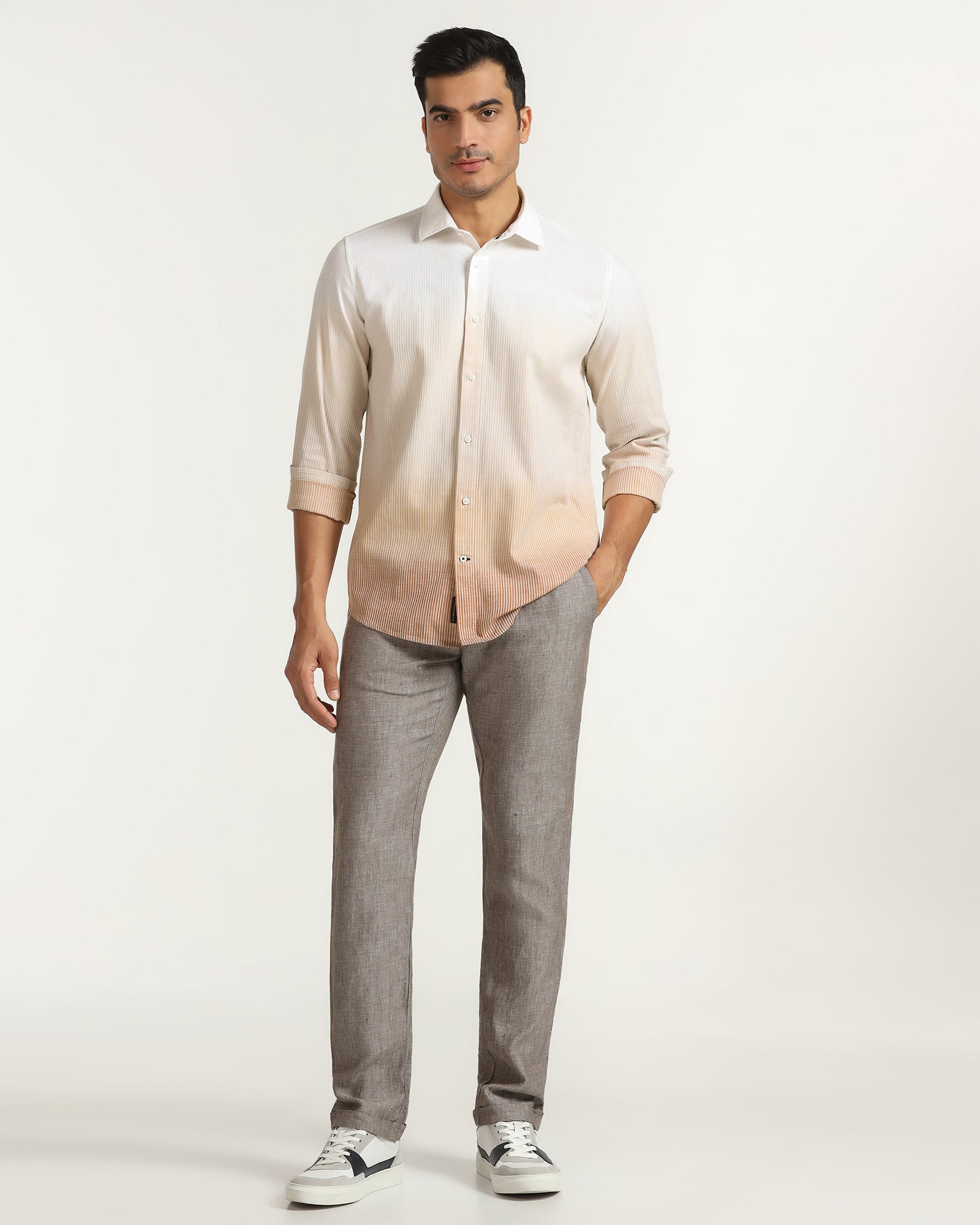 Brighten up your wardrobe with this Beige Printed Linen Shirt, your ultimate linen essential. The India slim fit flatters your form without feeling restrictive, while the semi-cutaway collaring gives a refined touch. This shirt for men is made from a soft flax linen fabric that offers a breathable feel and features a subtle dobby weave. The printed design brings a unique flair, making it a must-have.