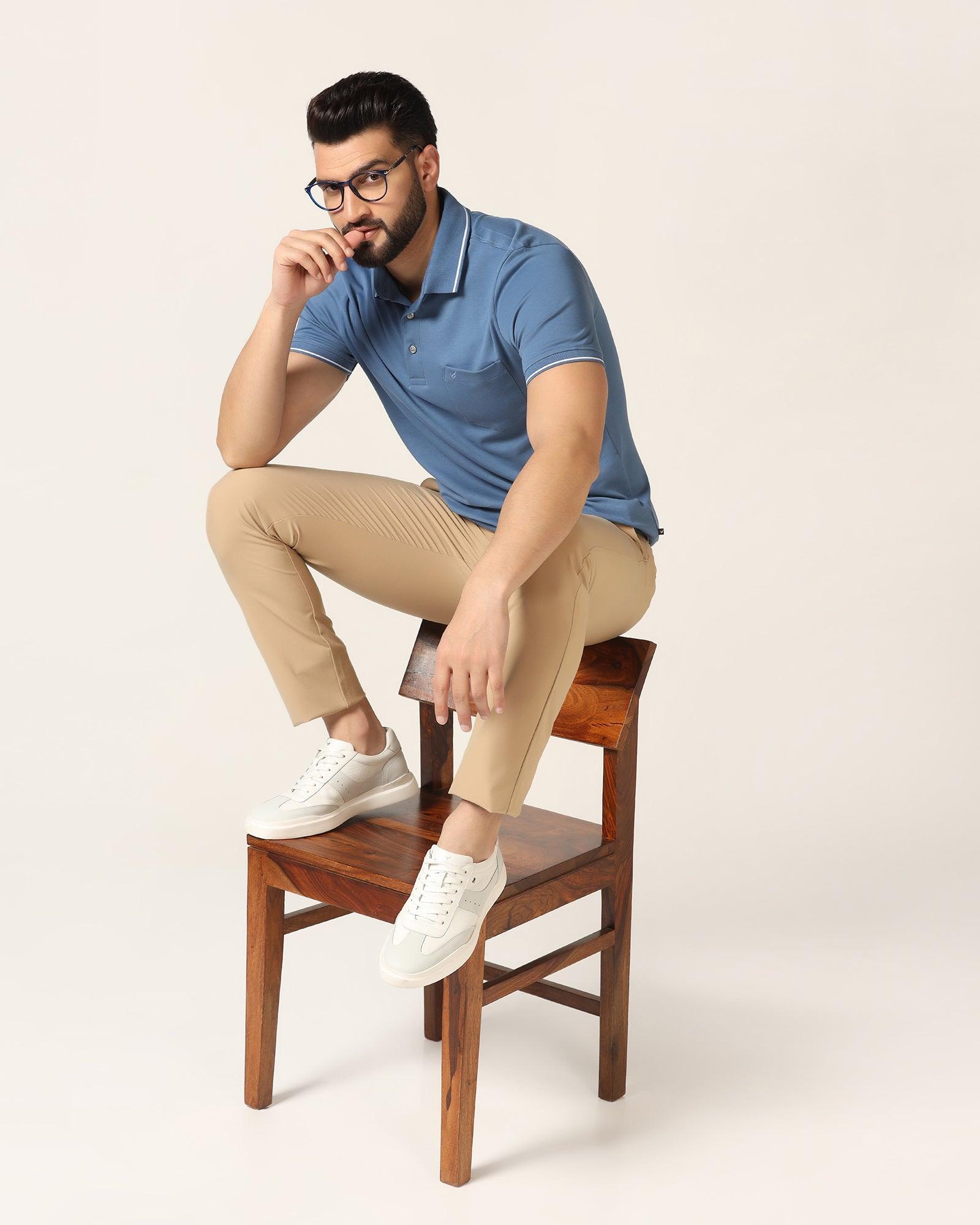 Redefine your everyday wardrobe with the Blue Solid T-shirt. Crafted with meticulous precision, this polo neck t-shirt boasts a slim fit, enhancing your silhouette with a modern edge. The half sleeves and stretchy, knitted fabric ensure flexibility and breathability, making it a perfect choice for any occasion. It has a striking blue colour that adds a touch of vibrancy, while the subtle pocket detail brings a hint of functionality.