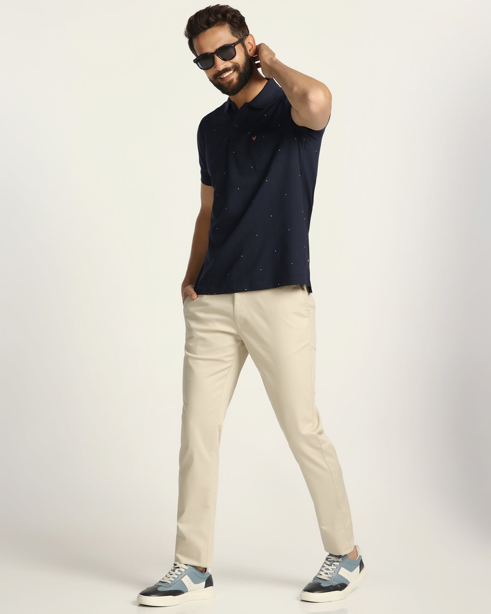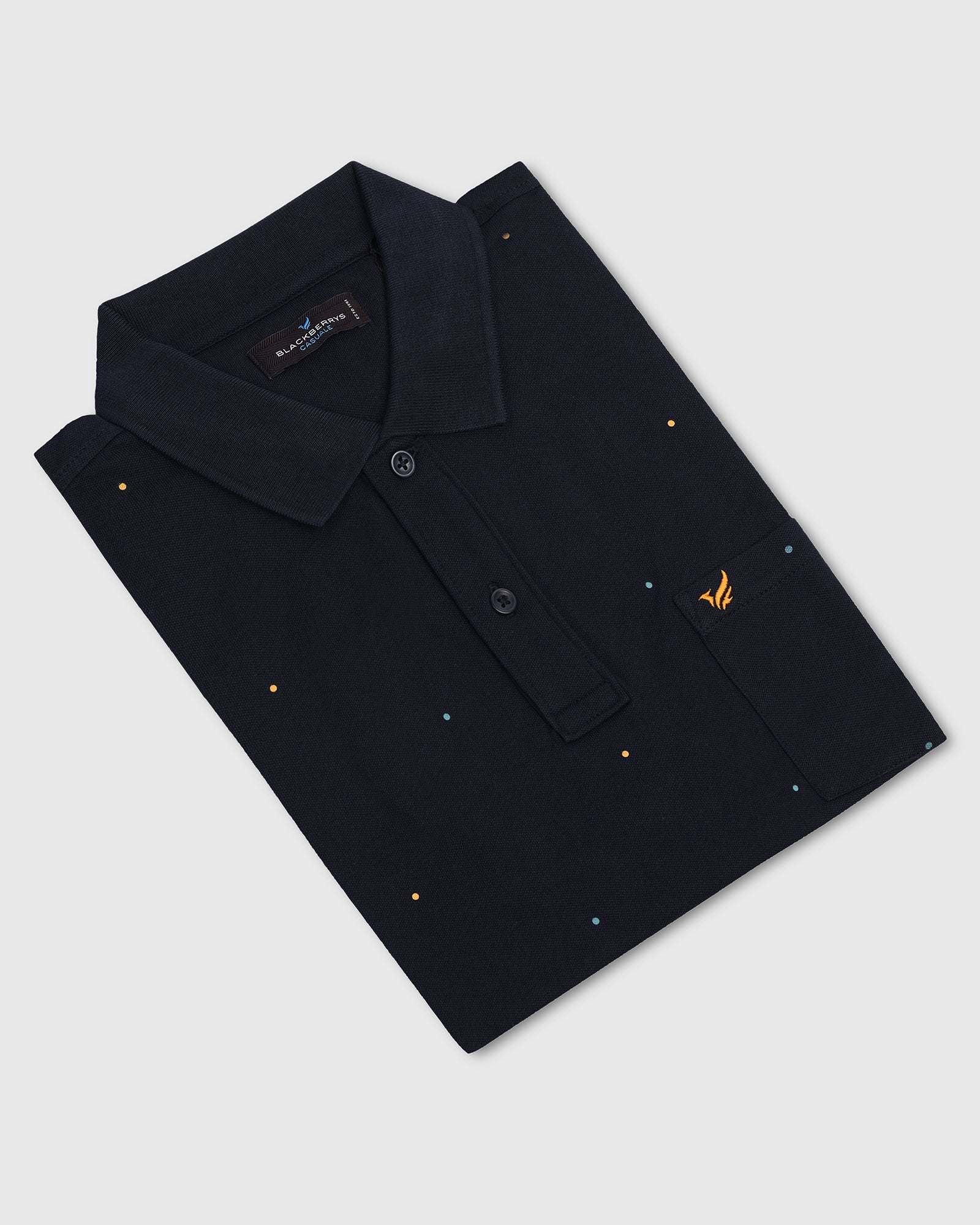 Go from weekend chill to workday chic with this Navy Printed T-Shirt. The all-over print adds a stylish touch, while the slim fit cut ensures a sharp, flattering silhouette. Featuring a classic polo neck collar and a chest pocket, this t-shirt for men is crafted from stretchable knit fabric with a pique weave, offering breathability and flexibility. Ideal for casual outings, it combines practicality with a contemporary edge.