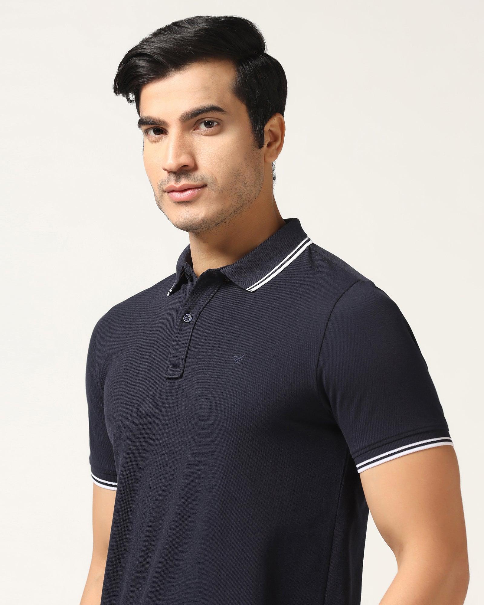 Revitalize your wardrobe with the Navy Solid T-shirt. Crafted for comfort and style, this polo neck t-shirt features half sleeves, a flattering slim fit, and a stretchable knitted fabric that moves with you. The deep navy colour adds flair to your look. Whether you're dressing up or down, this versatile t-shirt merges fashion and comfort, making it a must-have staple in every closet.