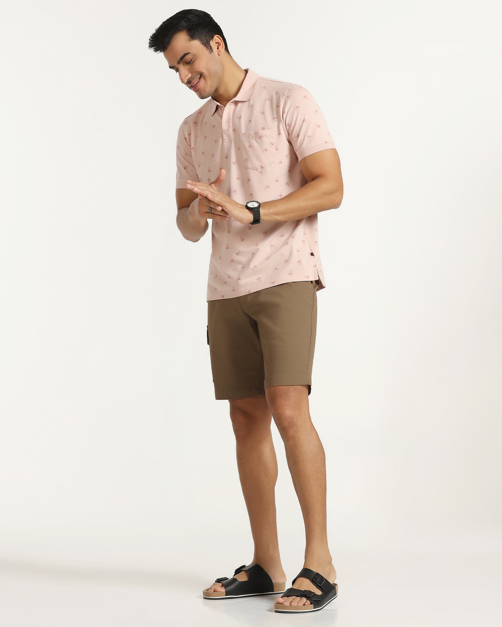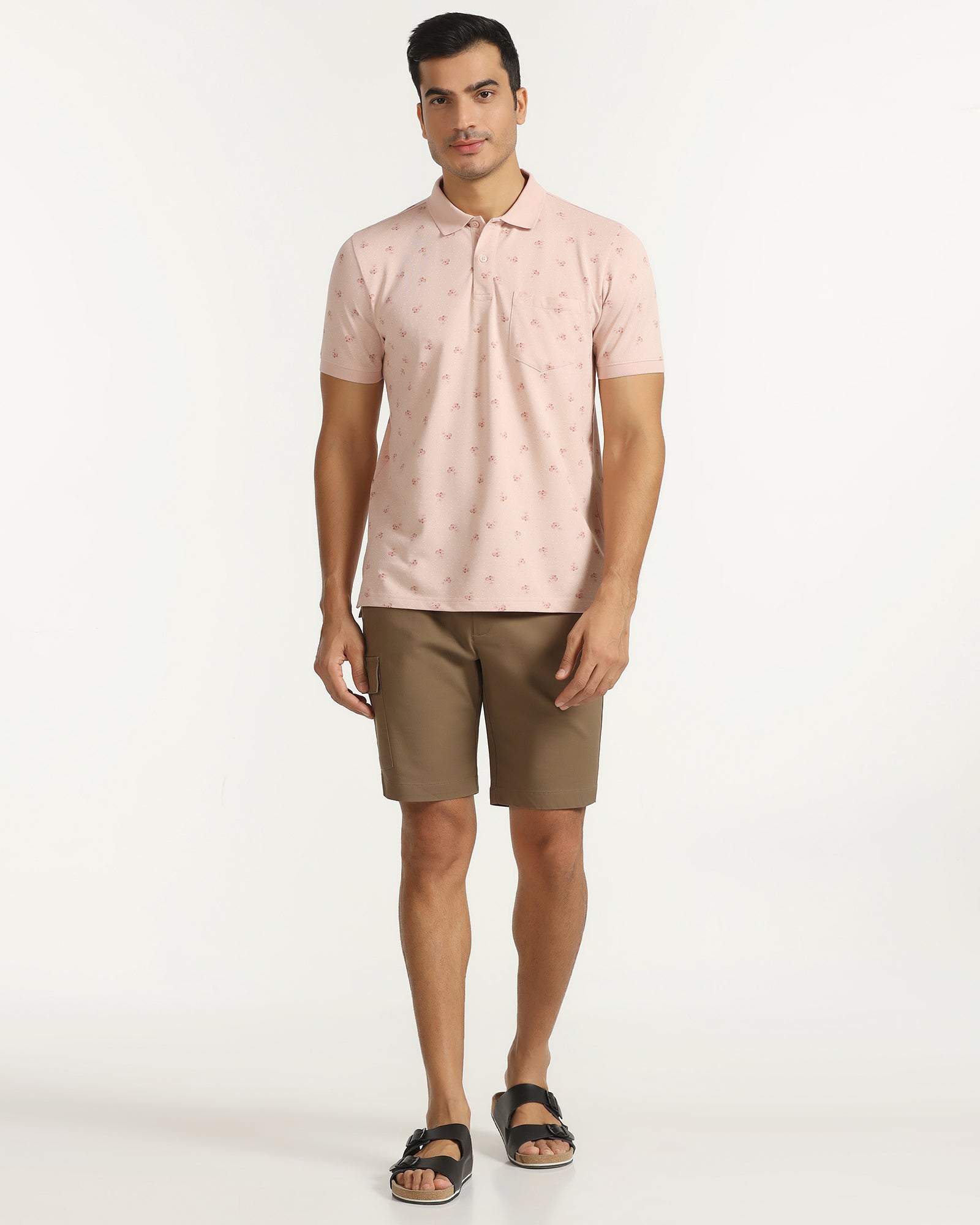 For a smart-casual look that never goes out of style, choose the Pink Polo Neck T-Shirt. Featuring a chic polo neck collar and a trendy print, it offers a slim fit that perfectly contours your body. It has a pique weave and an impeccable knitted fabric that is stretchable with flawless drapability. A subtle chest pocket adds a touch of sophistication, making this t-shirt for men perfect for those casual hangouts.
