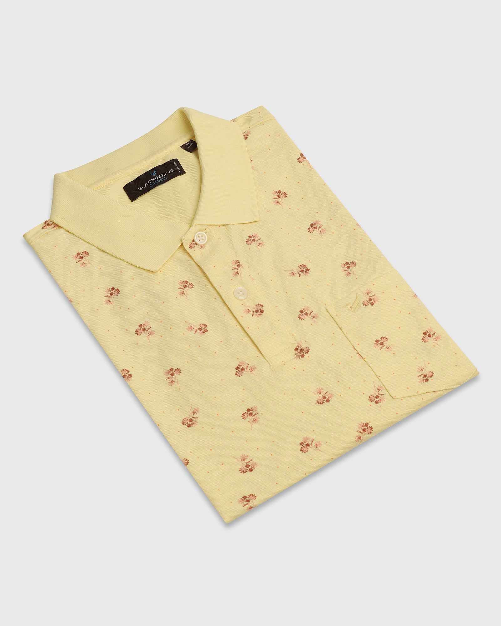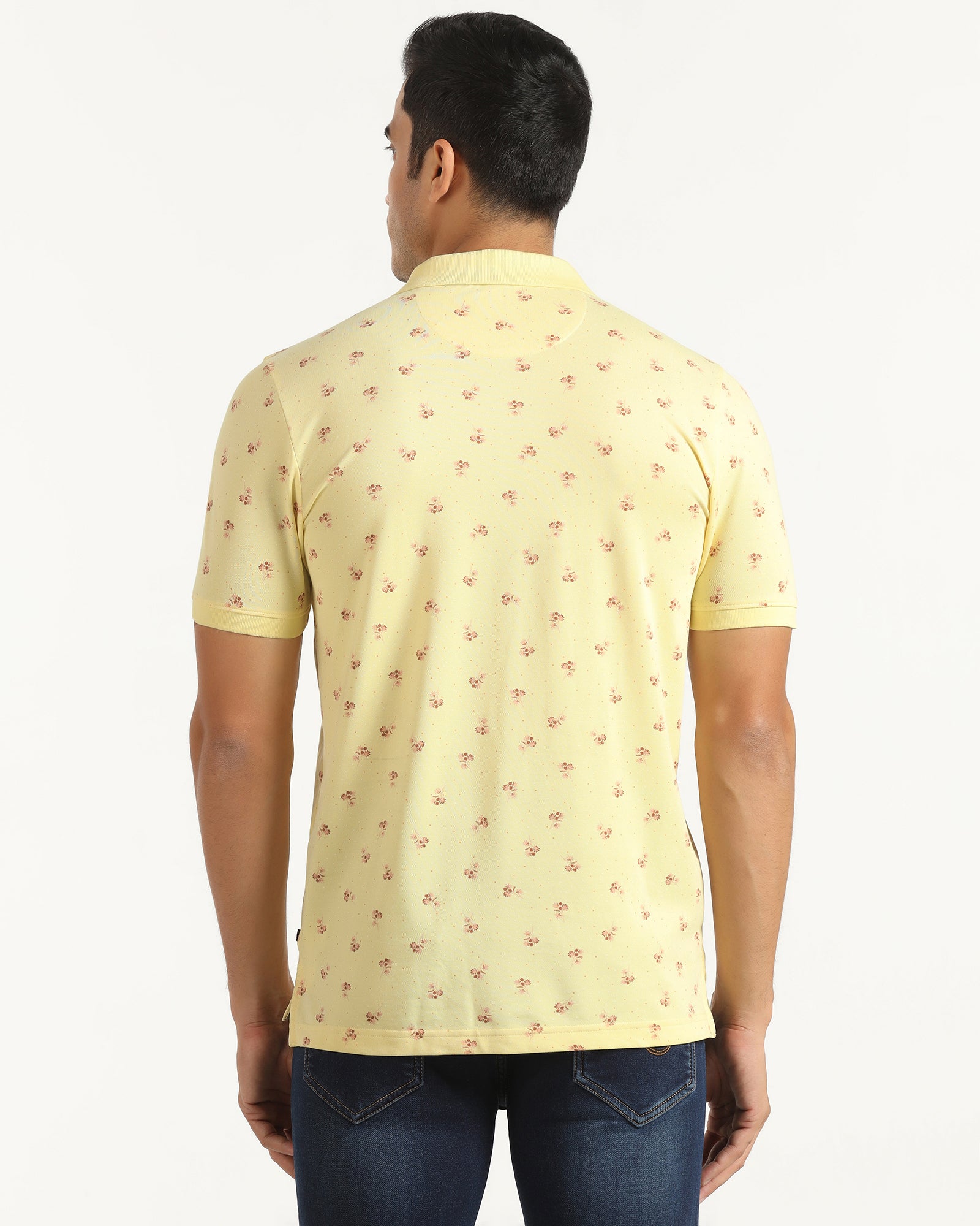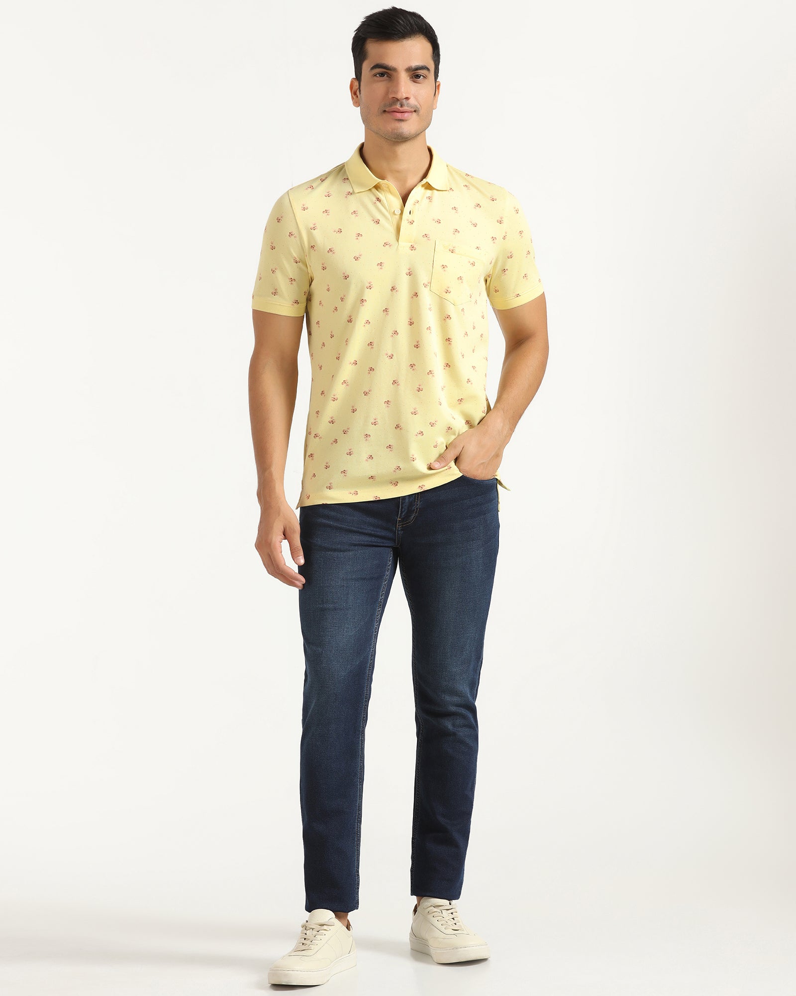 You will feel comfortable and stylish in this Yellow Polo Neck T-Shirt. Crafted with a smooth pique weave, this slim-fit t-shirt for men features a classic polo collar for a sharp look. The printed details add a touch of personality, while the impeccable knitted fabric is stretchable with flawless drapability. A chest pocket completes the design, making this everyday tee both practical and fashionable.