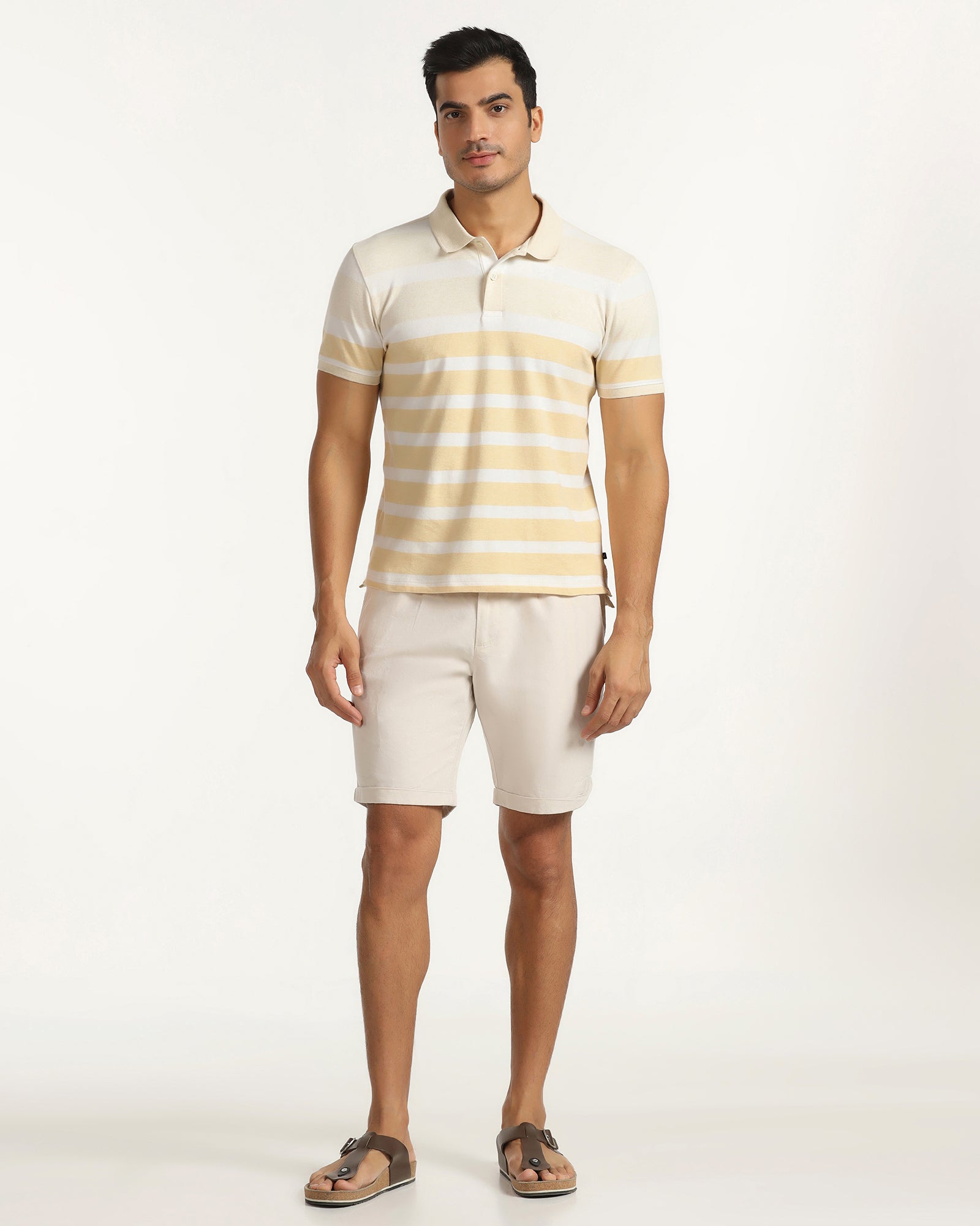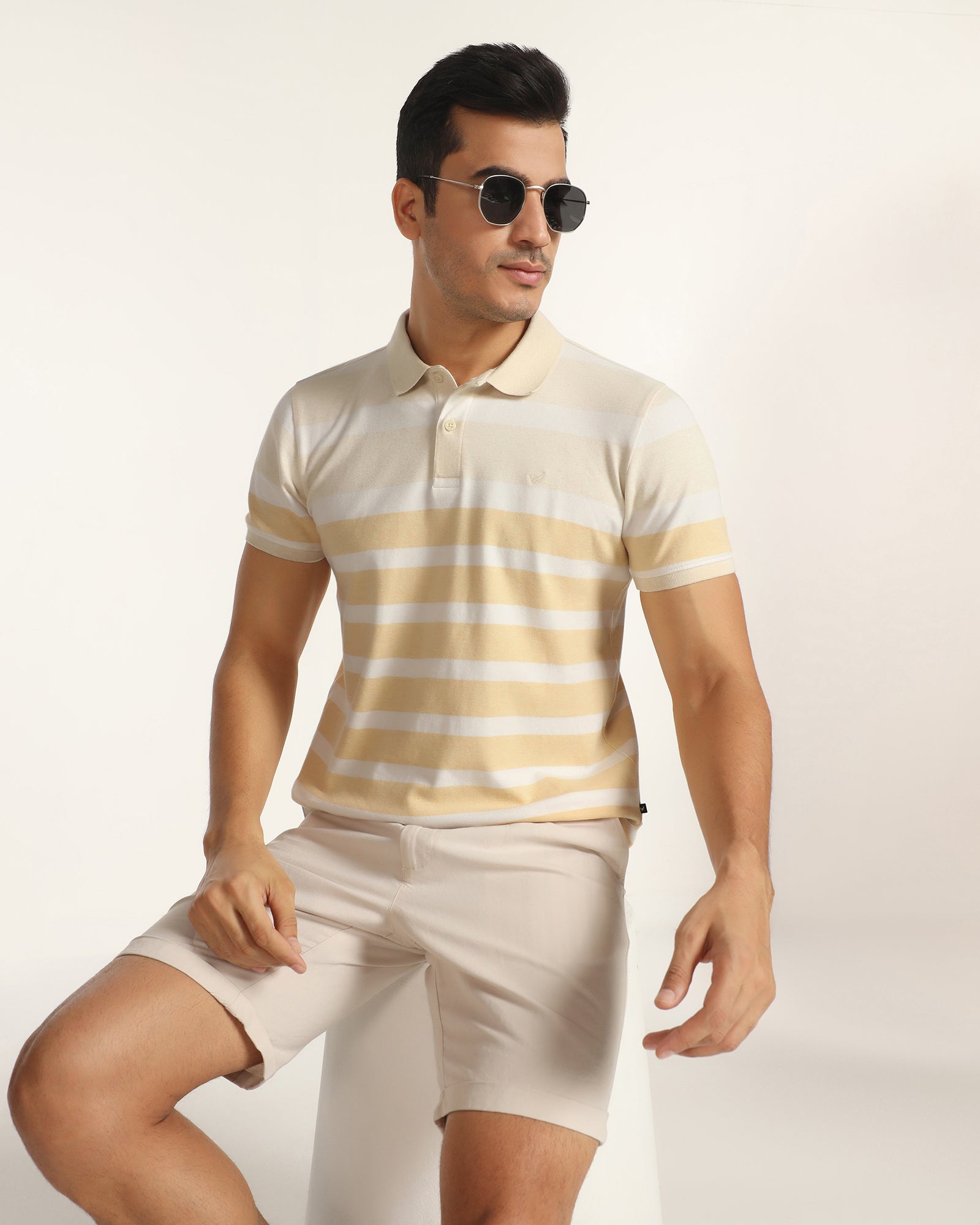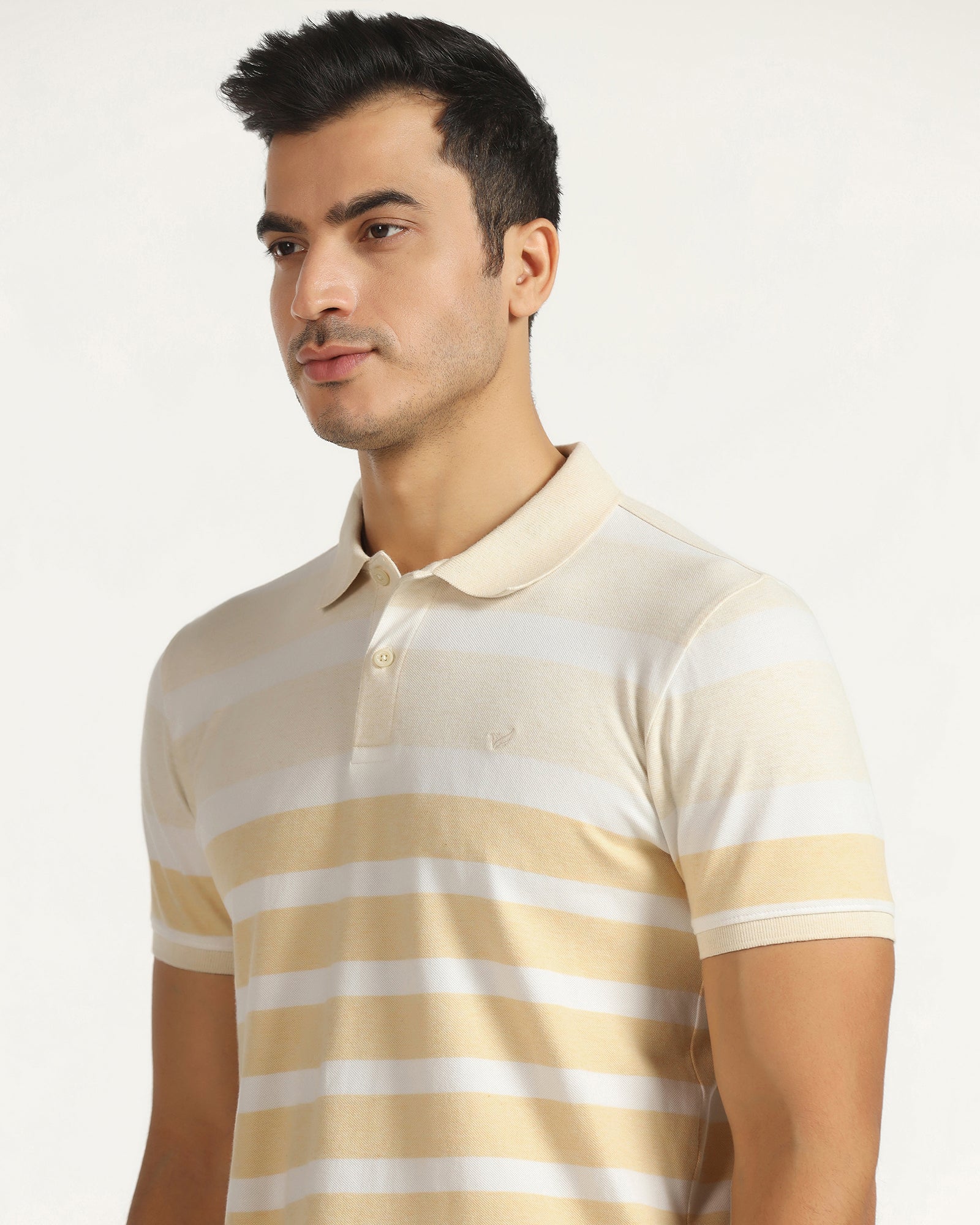 This Yellow Polo Neck T-Shirt makes a style statement while adding grace to your casual wardrobe. Featuring a classic polo neck collar and striped pattern, this slim-fit t-shirt for men perfectly balances style and comfort. It is crafted from stretchable knitted fabric with a durable pique weave that ensures ease of movement and a refined texture. Cosy short sleeves make it ideal for relaxed weekends or semi-casual outings.